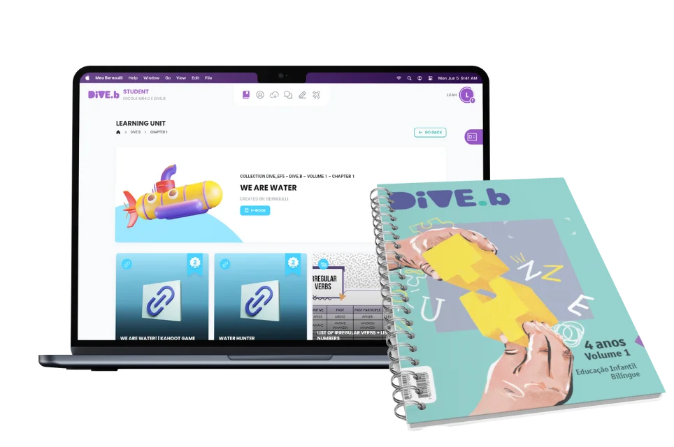 O DIVE.b gera uma aprendizagem fluida e contextualizada do inglês. Com abordagem lúdica, promove experiências valiosas e estimula o raciocínio. As atividades da Educação Infantil estão relacionadas ao campo das experiências, complementando o cotidiano dos alunos.